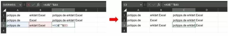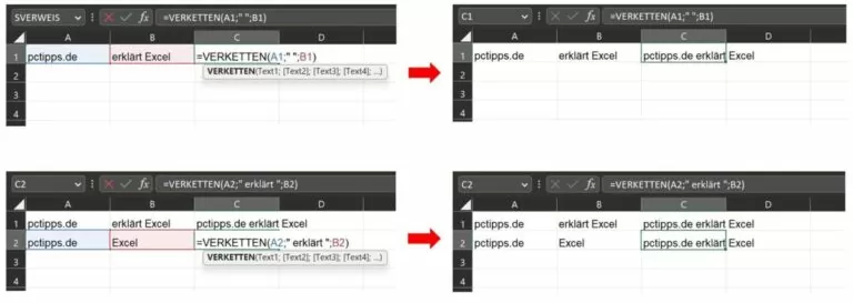 Desde Excel 2019 hay un sucesor de CONCATENATE. La función TEXTCHAIN proporciona una forma más flexible de conectar valores de texto y números, especialmente cuando se trata de formatear números. Utilice la siguiente sintaxis: =CADENA DE TEXTO(Texto1, Texto2, ...).
